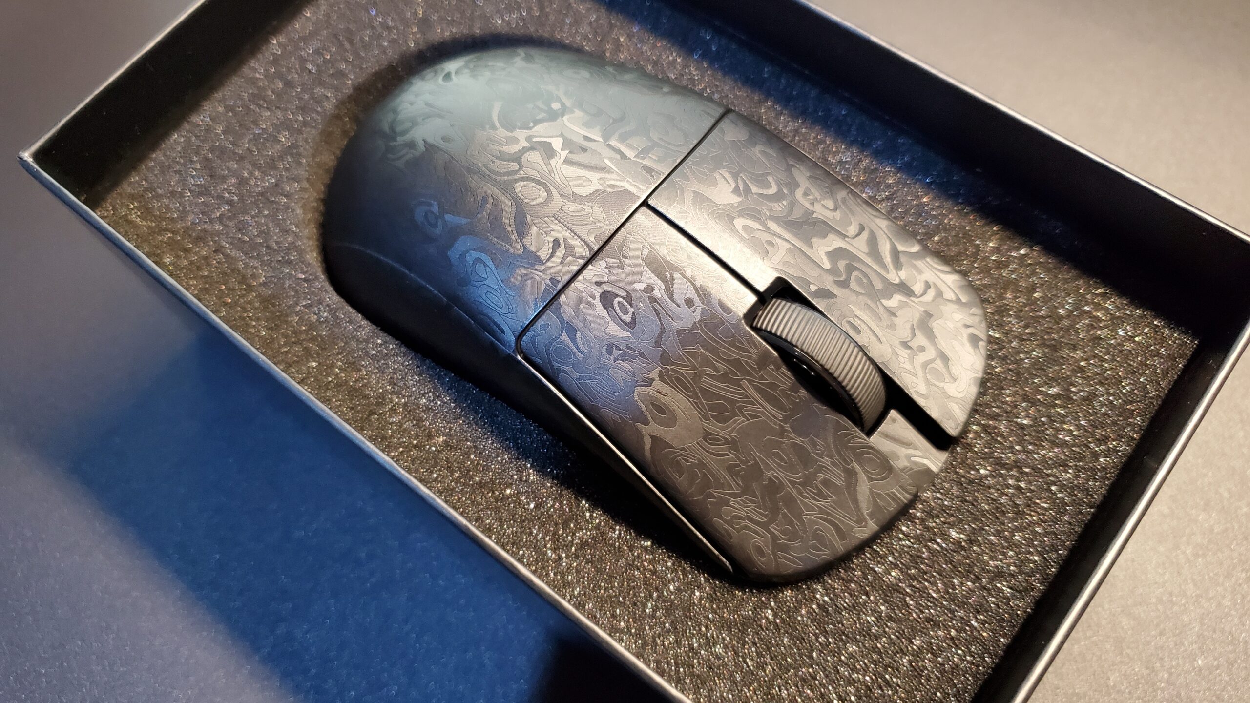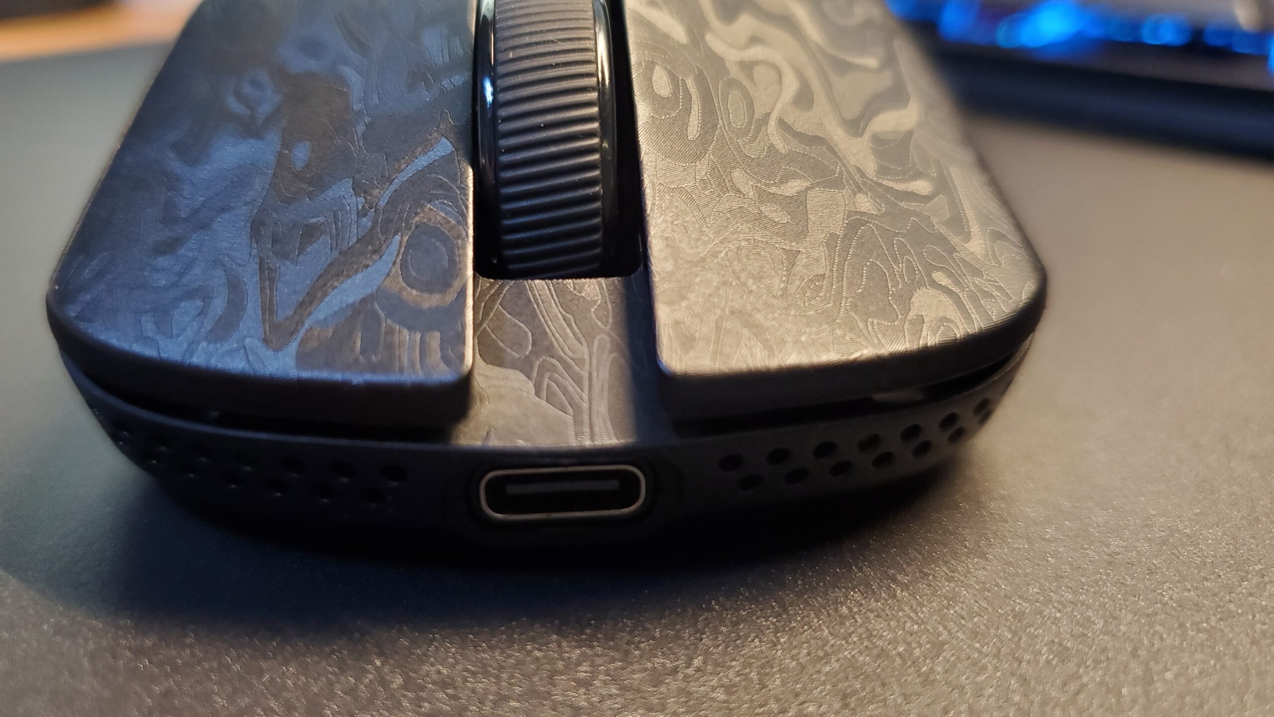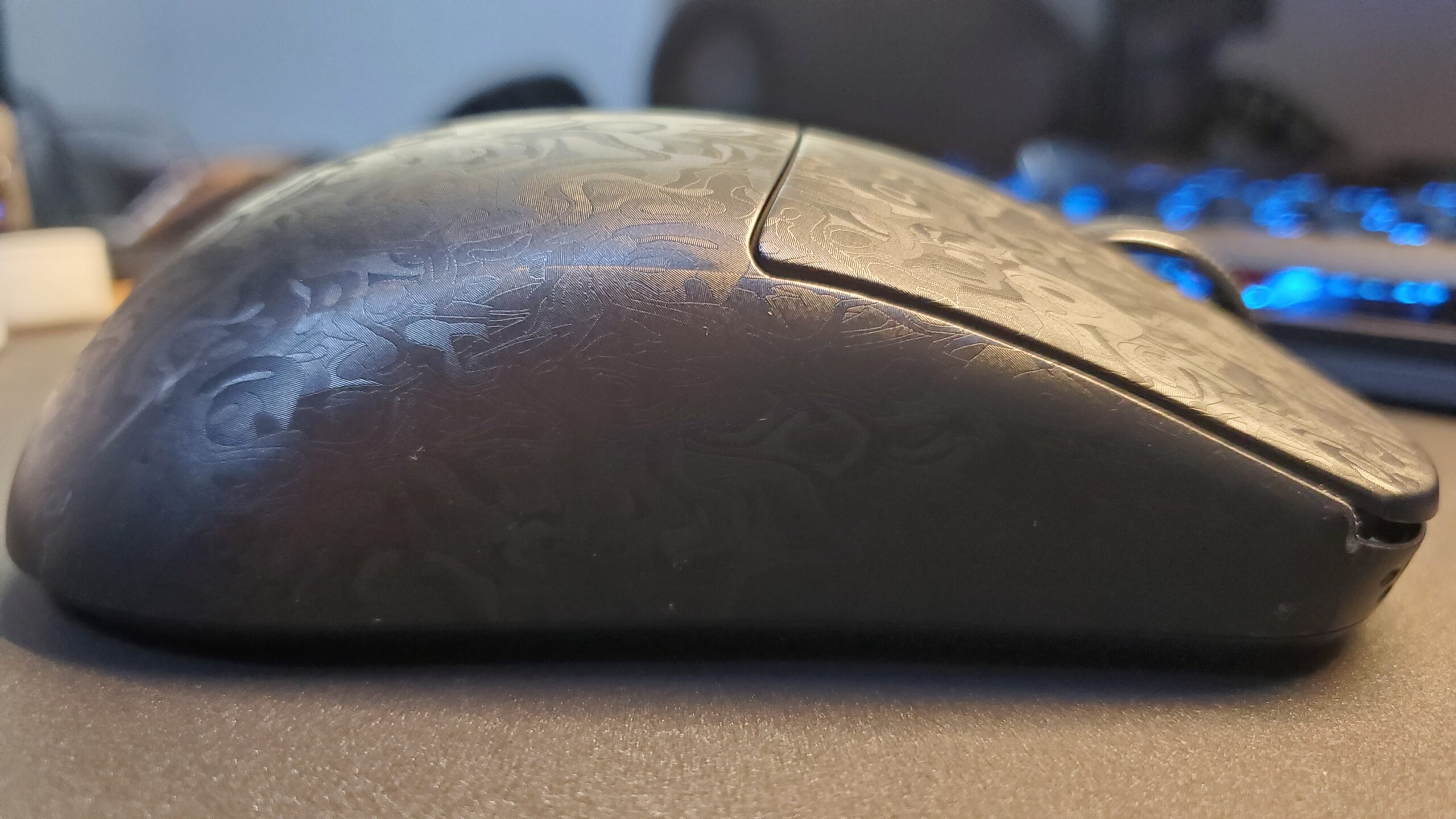 特徴的な触感:ザラッとした独特の手触りが徐々に手に馴染み、グリップテープ不要でも高いグリップ力を発揮。他の素材では出せないカーボン柄が、ゲーミングデバイスの域を超えた高級感を演出します。