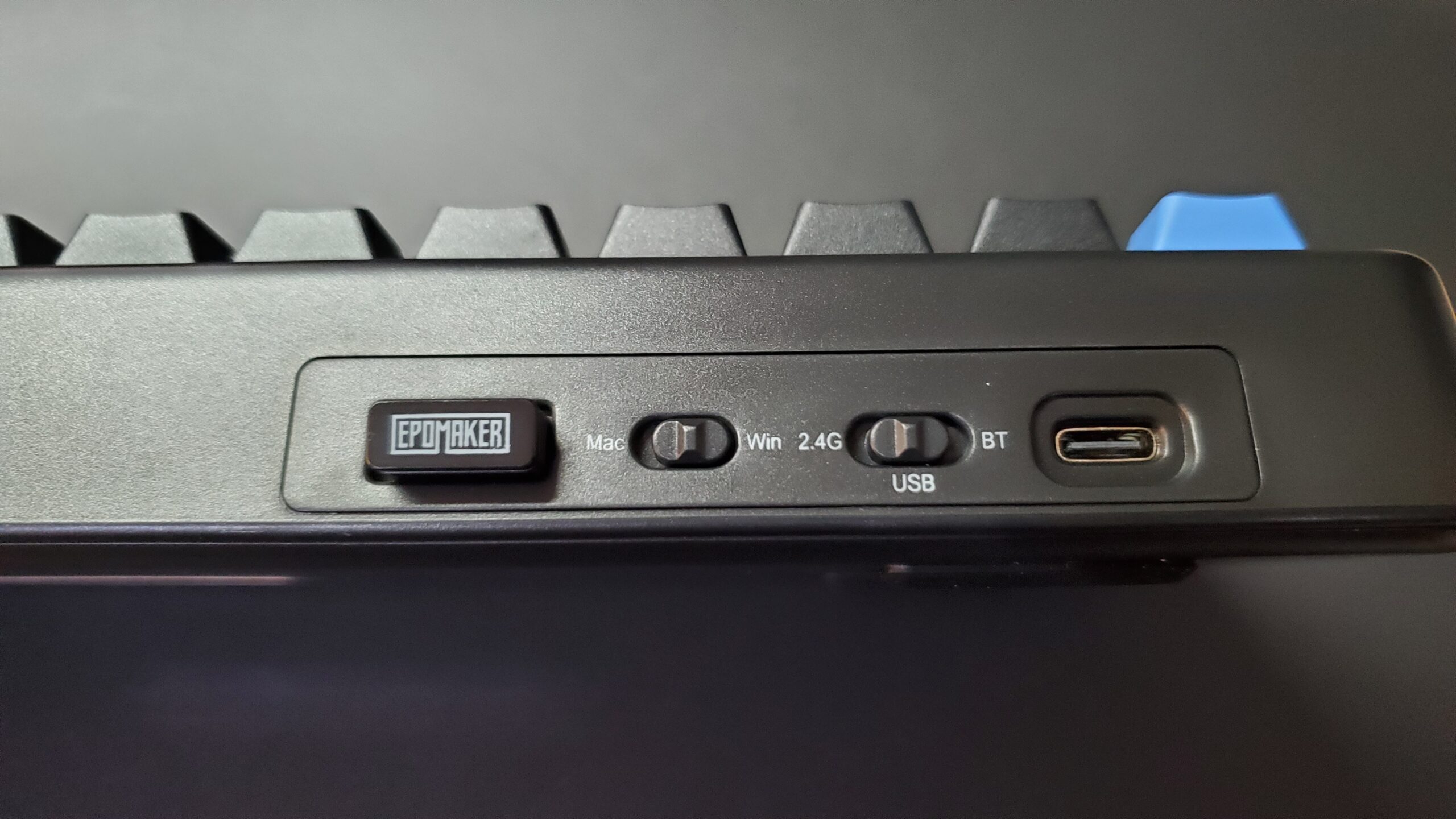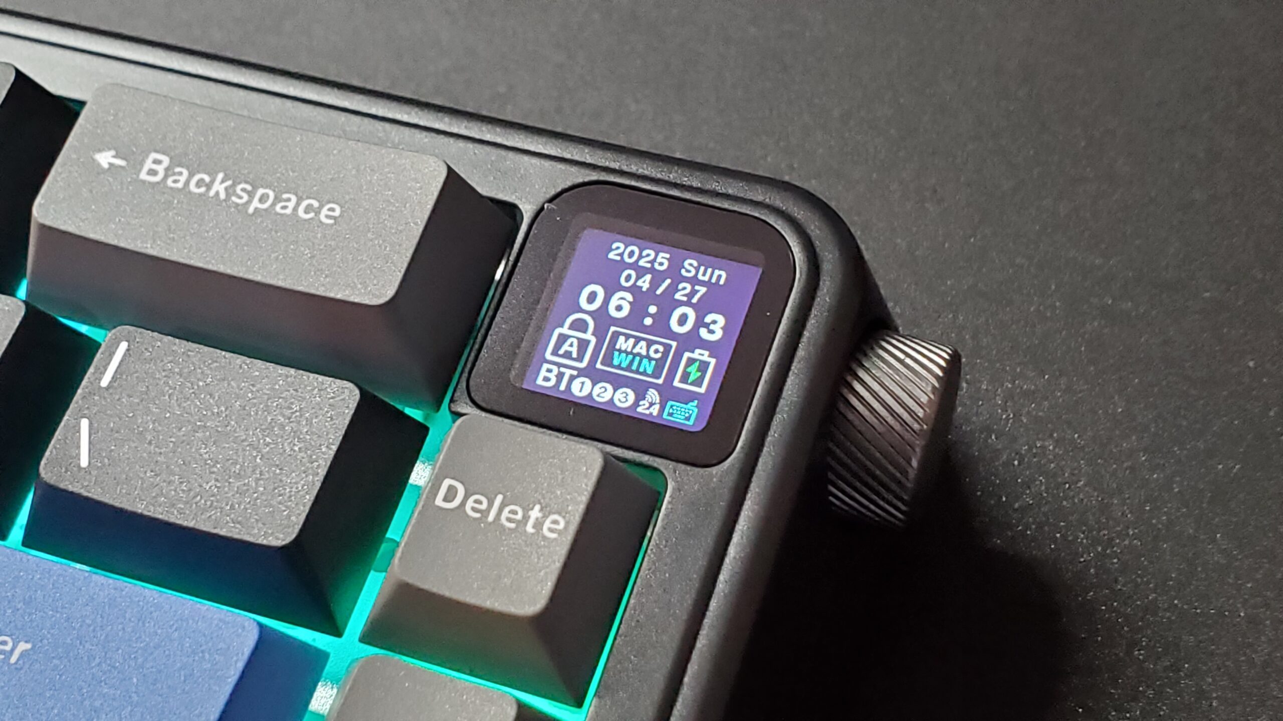 ABS筐体ながら内部にアルミプレートを仕込み、剛性は文句なし。トップ右上のTFTスクリーンは時刻・バッテリー・接続モードを常時表示し、隣のアルミノブで音量を瞬時にコントロールできます。背面には接続切替スライダーと2.4 GHzドングルホルダーを搭載。持ち運び時にレシーバーを紛失する心配がありません。