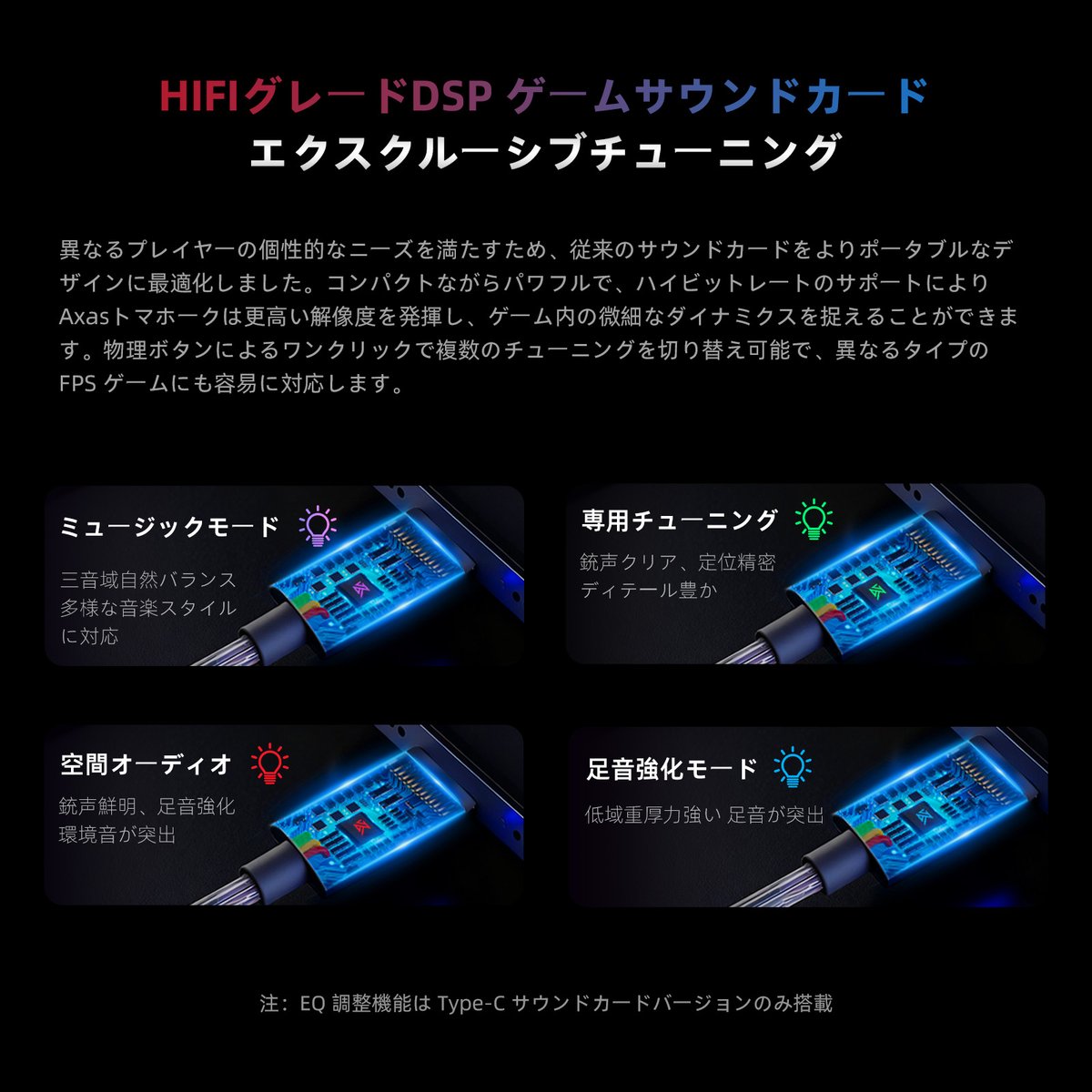| Type-C版特徴 | 専用DSPサウンドカード内蔵、4モード切替 |