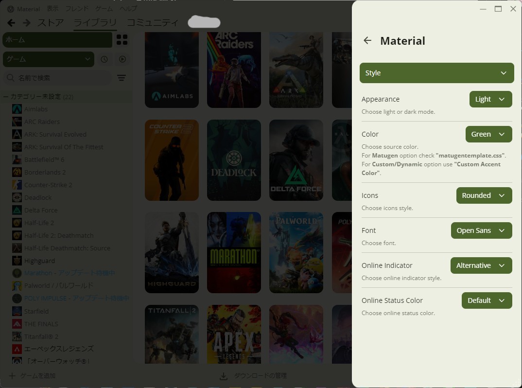 テーマは「material」以外にも多数公開されています。例えばブルーアーカイブ風のテーマなども存在しており、好みに合わせたカスタマイズが楽しめます。テーマ一覧はsteambrew.app/themesから確認できます。